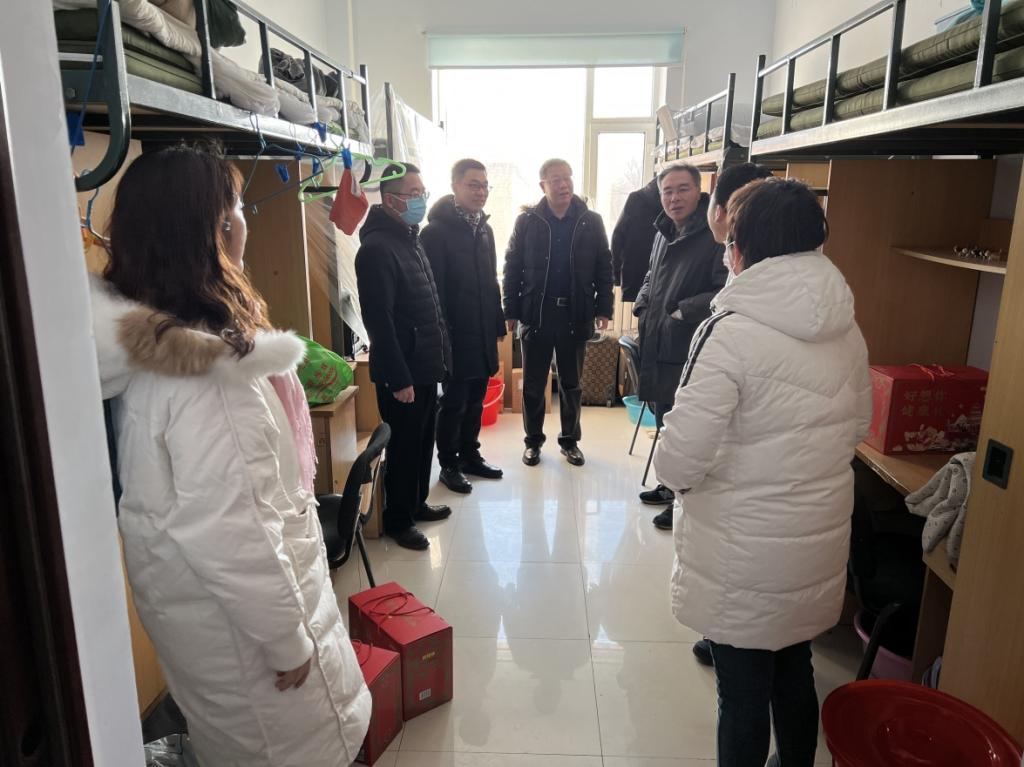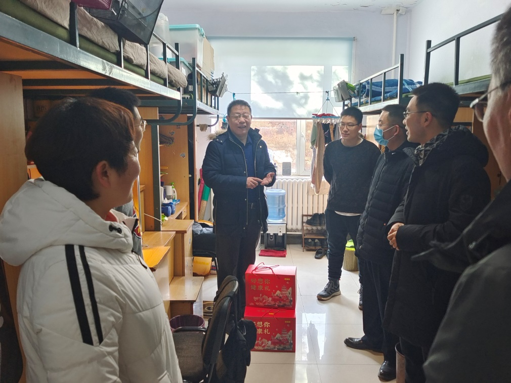公司执行经理郭威、党委副书记闫国栋、副经理王伯昕、副经理曹品鲁、研究生综合办公室主任王慧娣、思政秘书汤海燕共同来到员工宿舍,察看留校研究生的学习生活环境,向同学们发放公司新春祝福礼包,并致以新春祝福。