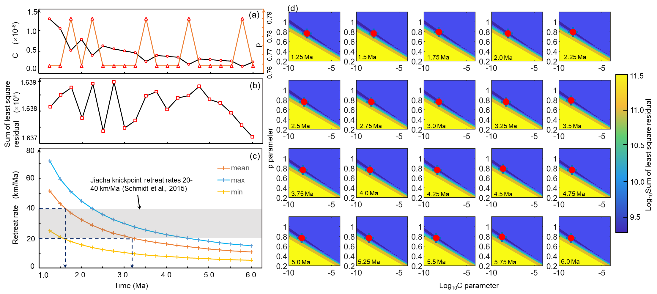 通过坡度面积法和积分分析法重建的河流古剖面,流域经历着以速率为0.27–1.28 mm/a的侵蚀切割,并获取了对应裂点分布位置。然后根据裂点分布位置的高程,将区域裂点划分为了离散且固定的堰塞型裂点和集中且移动的4k裂点群。由波速模型(Celerity model)的计算结果表明拉月曲流域内4k裂点群的迁移速率为10.8–51.7 km/Ma。上述结果说明拉月曲流域是一个快速剥蚀区,尤其是在两条支流汇聚之后,为东构造结快速剥露北迁的假说提供了有力的支撑,为川藏铁路建设与安全提供了参考。
