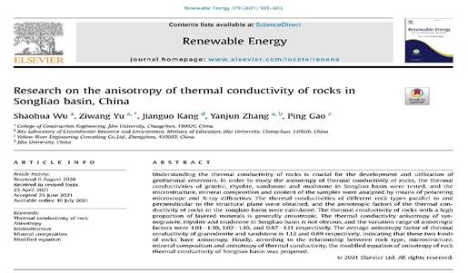 2021年7月,韦德体育于子望副教授团队,在国际著名学术刊物《Renewable Energy》上发表题目为“Research on the anisotropy of thermal conductivity of rocks in Songliao basin, China”的论文,针对松辽盆地岩导热系数各向异性特征进行了研究,对于研究区地热能开发具有重要意义。