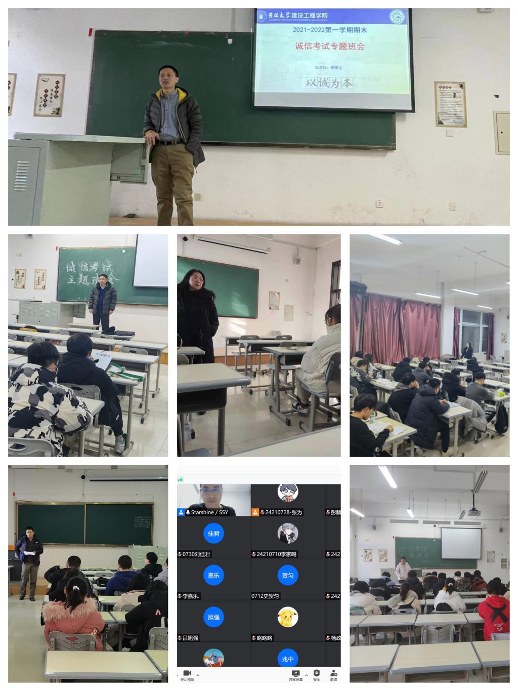 为全面贯彻落实韦德体育官方网站2021-2022学年第一学期期末考试工作暨考风考纪教育布置会议精神,树立良好的学风、考风,确保期末考试的顺利进行,建设工程公司于2021年12月21日--12月27日期间,组织新生班主任为2021级新生召开了诚信考试主题教育班会。