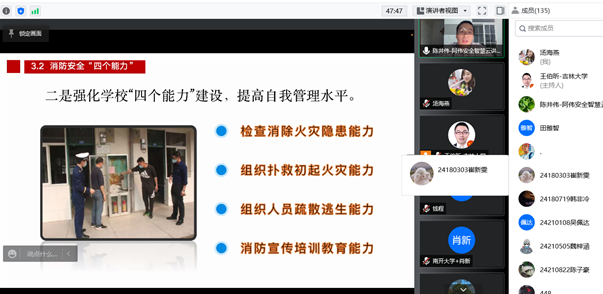 最后,汤海燕老师对报告的内容进行了总结,希望通过陈总工程师的讲解,可以进一步增强师生的防范意识和应急处理能力,了解和掌握了如何识别危险、在工作、学习中采取必要的应急措施等基本操作,树牢安全责任与意识。希望同学们在校园封闭期间要保持良好心态,绝不可以触及消防安全红线,希望大家发扬坚韧担当的建工人精神,我们共克时艰,共同努力,争取早日在校园相聚。