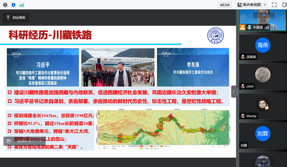 宋老师回顾了在怒江松塔水电站项目、川藏铁路、金沙江上游等项目中,从做实验到认真总结实验数据、分析研究工程地质分区的过程。宋老师着重介绍了川藏铁路这一项支撑西藏社会经济发展、保障国防安全的重大工程。这是一项加强西藏与内地联系、巩固边疆长治久安的重大举措,是为全面落实习近平总书记关于建设川藏铁路的指示精神背景下立项的,是新时代历史性、世纪性战略工程。