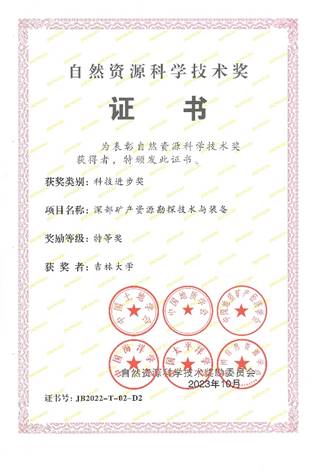 近日,自然资源部发布《2022年度自然资源科学技术奖获奖成果公告》,公司作为第二单位完成的“深部矿产资源勘探技术与装备”成果获自然资源科学技术奖特等奖,韦德体育张晓培教授、牛建军教授分别为第二完成人和第七完成人,中国地质科公司矿产资源研究所为成果牵头单位。