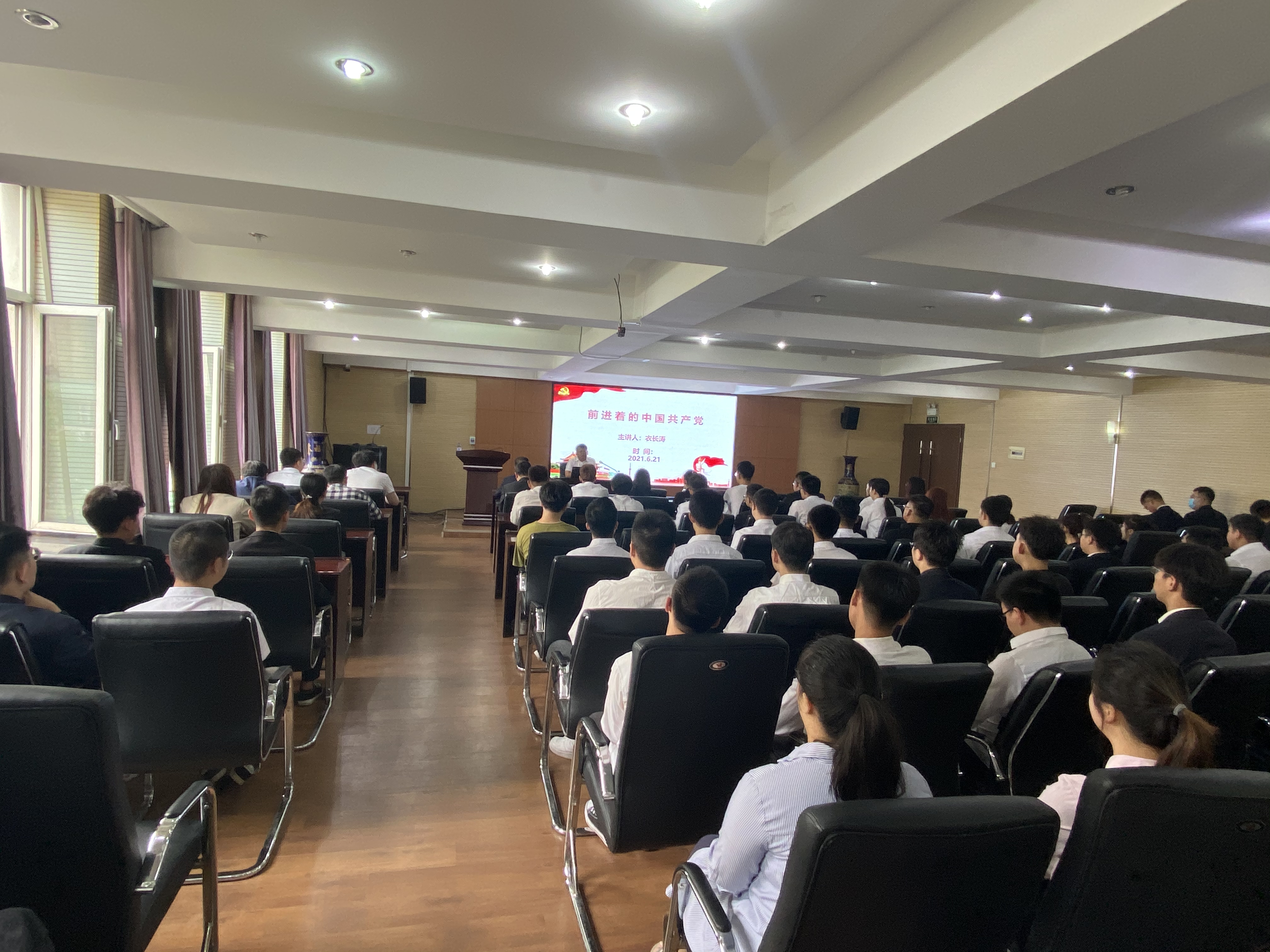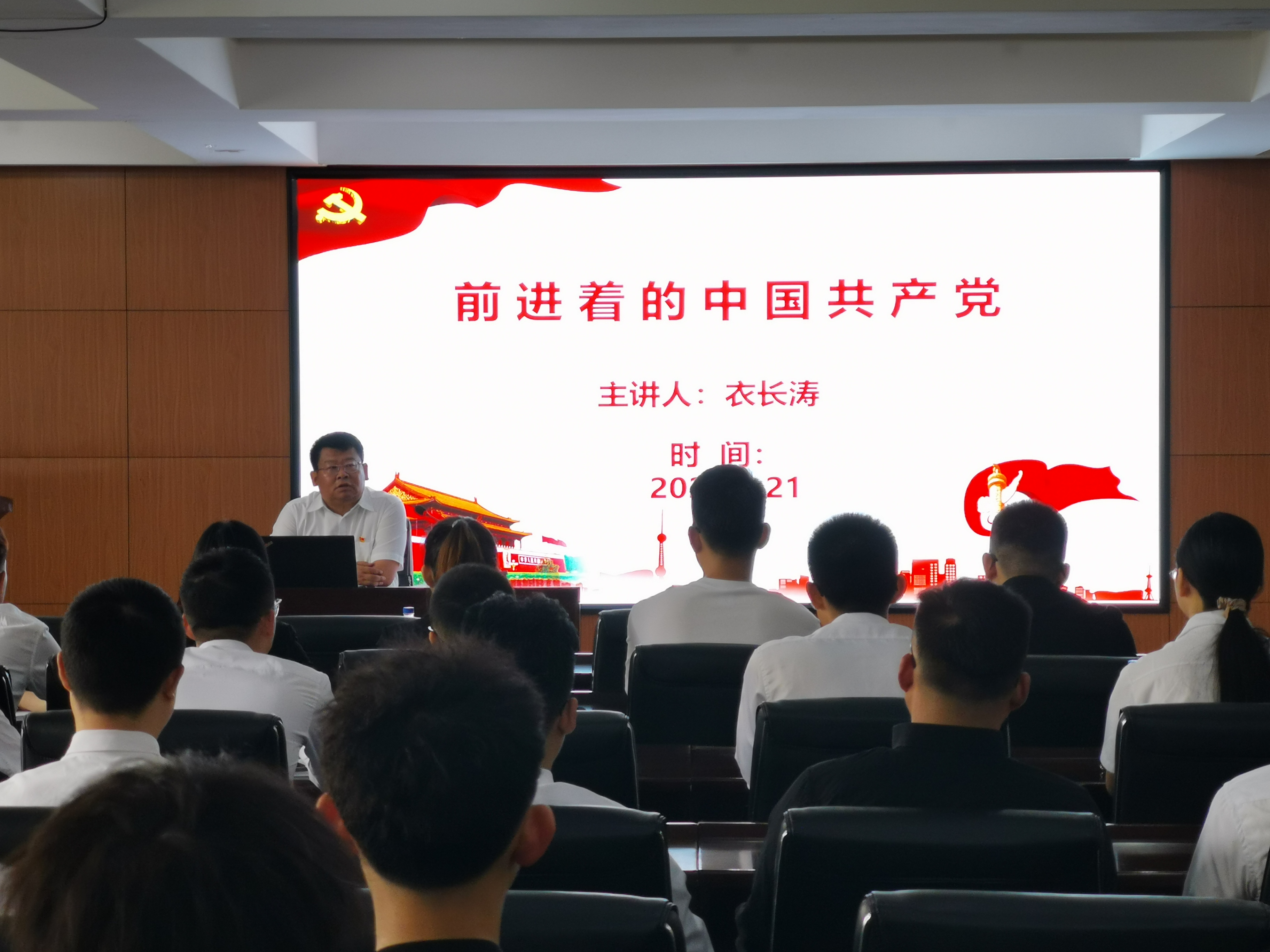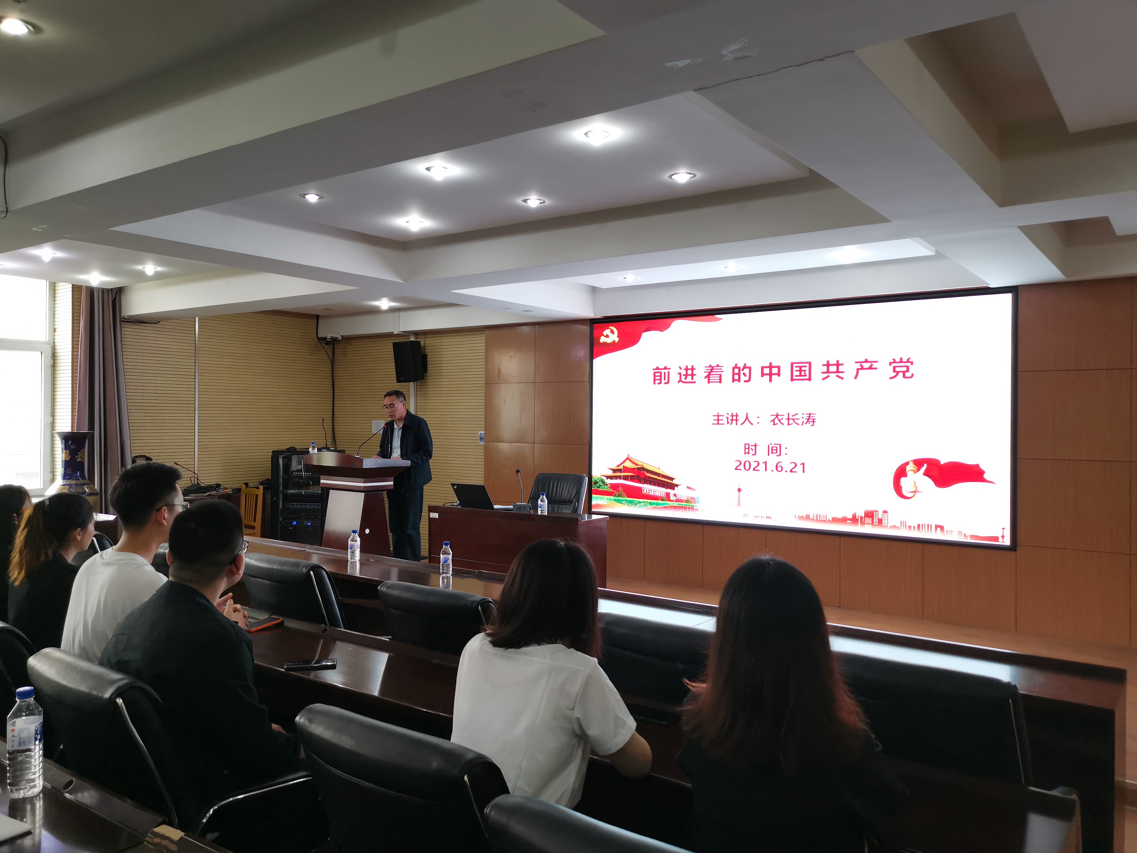 党委书记衣长涛从中国共产党科学的理论指导、坚定的理想信念、强大的组织优势、坚实的群众基础、彻底的自我革命五个方面带领员工党员全面回顾了党带领中国人民从站起来到富起来再到强起来,波澜壮阔一百年的奋斗历程,从学史明理、学史增信、学史崇德、学史力行四个方面,激励毕业生党员争做堪当民族复兴大任的时代青年。