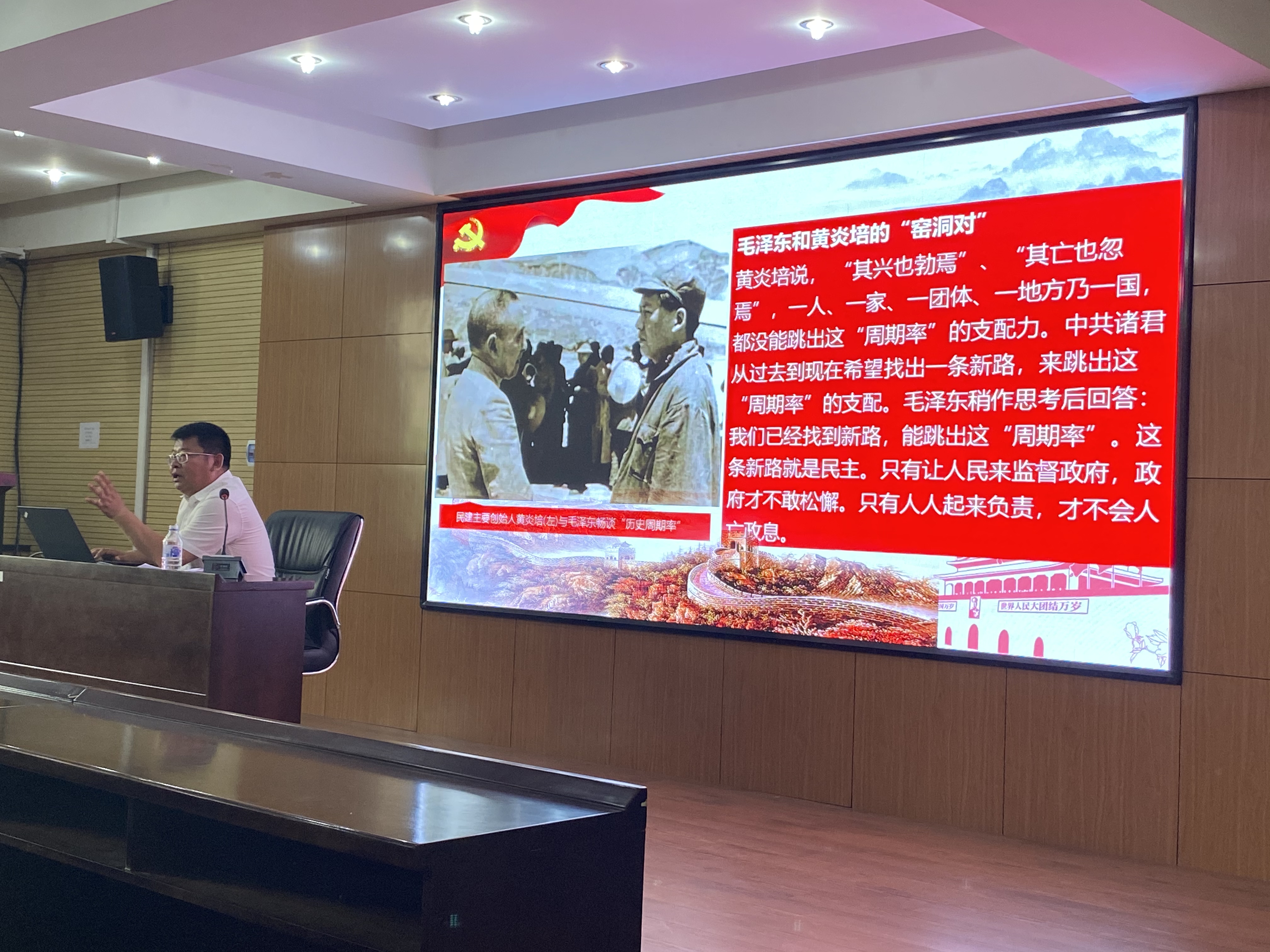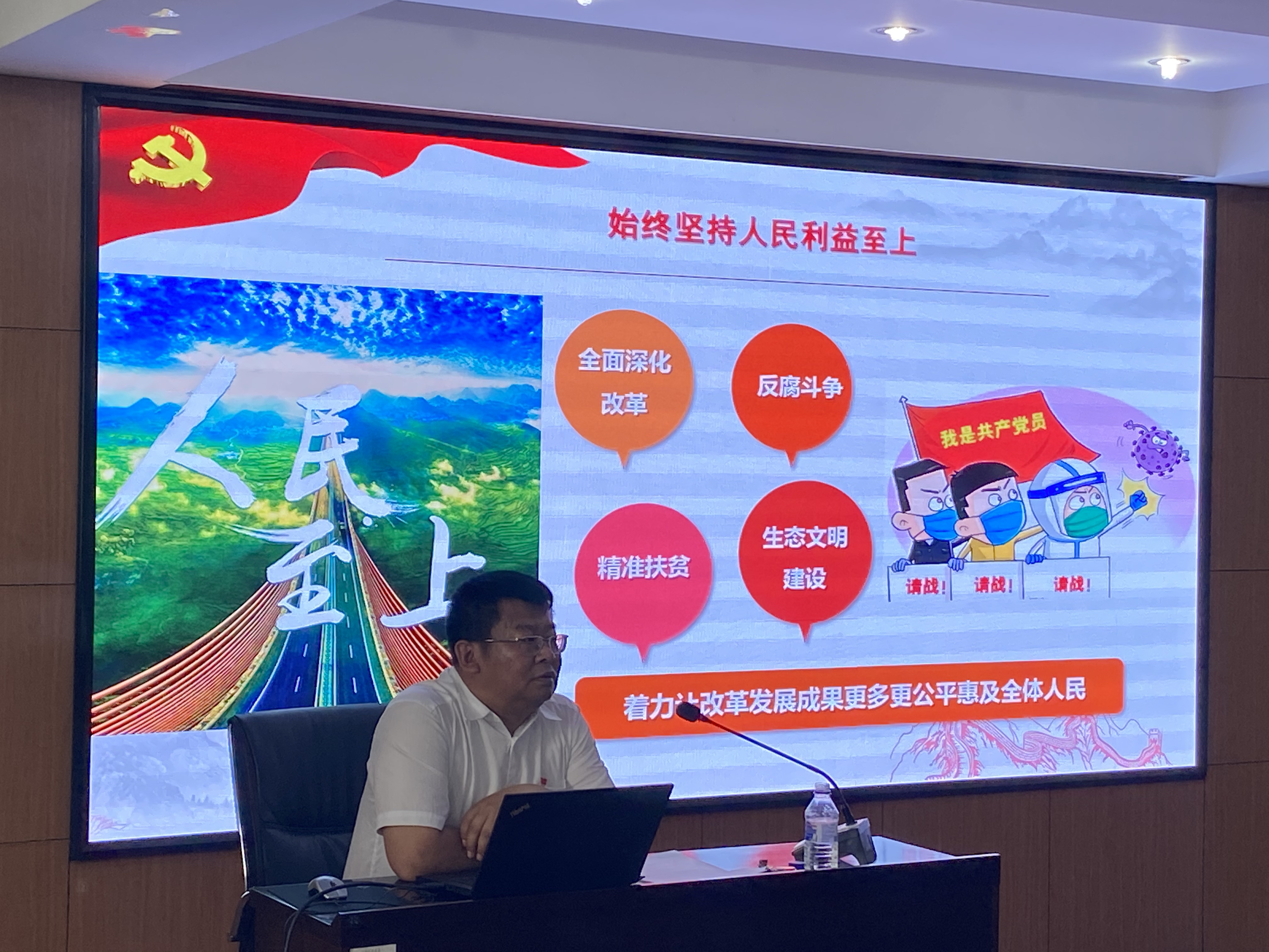 衣书记首先从毛泽东思想、邓小平理论、三个代表重要思想、科学发展观、习近平新时代中国特色社会主义思想论述中国共产党坚持在实践中不断丰富和发展马克思主义;从1942年延安整风运动到2021年党中央决定在全党开展党史学习教育以印证思想建党、理论强党始终贯穿于党的建设全过程。提及坚定的理想信念,衣书记列举华西村、黄大年、抗击新冠肺炎疫情等事例,论证中国共产党不畏艰难、不怕牺牲而坚守初心的信念和意志,以此激励员工党员坚定理想信念,补足精神之“钙”。随后,衣书记讲述了中国共产党严密的组织体系和严明的组织纪律。衣书记强调,中国共产党把人民拥护不拥护、赞成不赞成、高兴不高兴、答应不答应作为衡量一切工作得失的根本标准,以人民对美好生活的向往为奋斗目标,这是共产党具有强大的群众基础的原因。衣书记最后讲到中国共产党勇于自我革命的意义,即锻造了风清气正的政治生态,并以此激励员工党员勇于自我革新,不断提高自我。