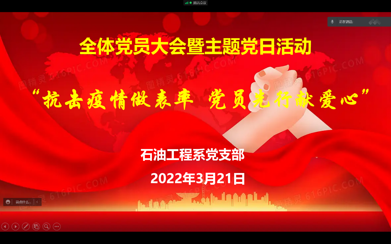 为了充分发挥基层党支部的战斗堡垒作用,弘扬抗疫精神。2022年3月21日,韦德体育石油工程系教工党支部开展了“抗击疫情做表率,党员先行献爱心”支部全体党员大会暨主题党日活动。